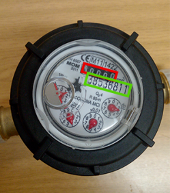 - Zählernummer (grüner Rahmen) und den Zählerstand (roter Rahmen) ablesen